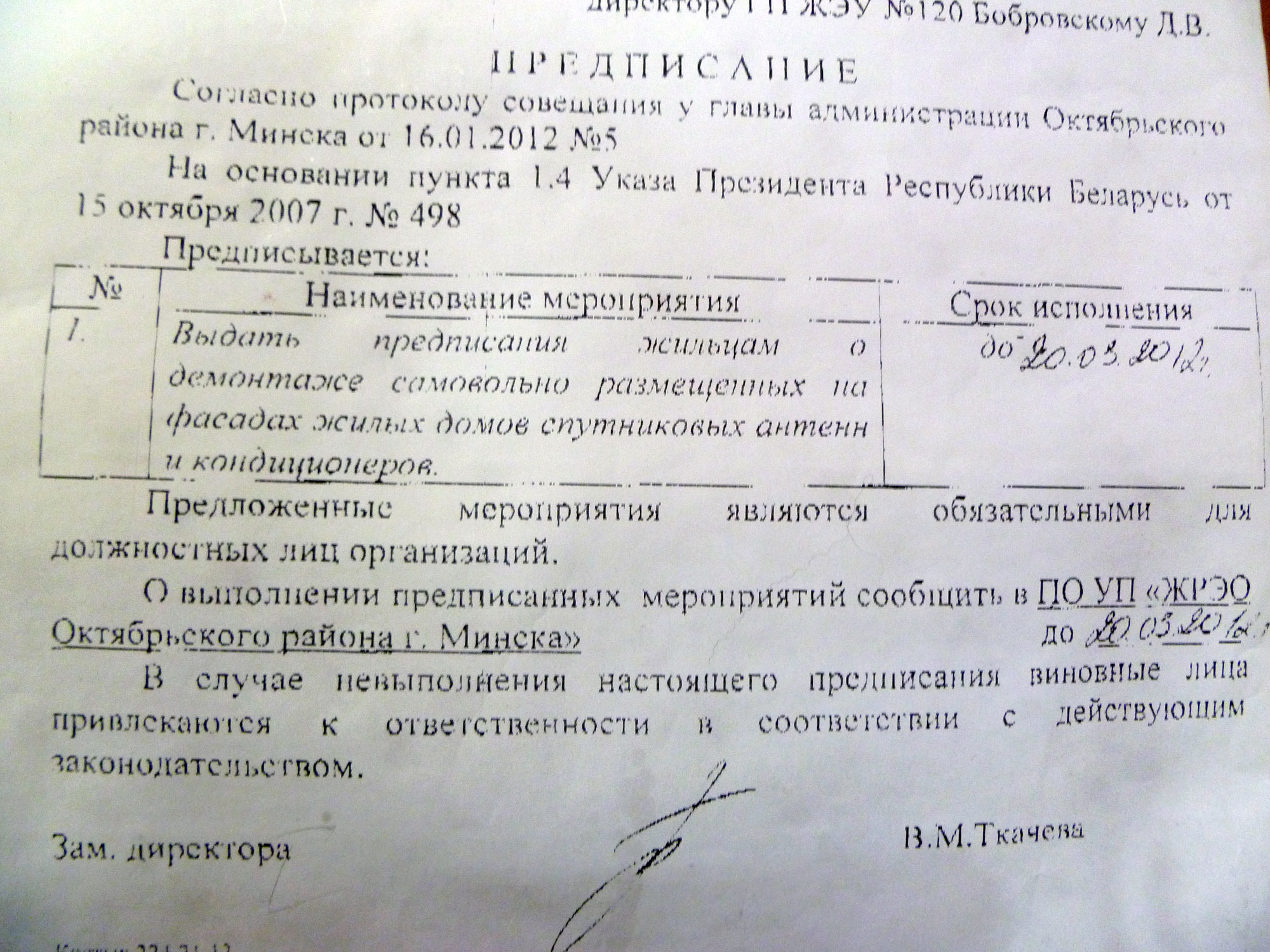 «Кастрычніцкая адміністрацыя афіцыйна дала нам загад уручыць прадпісаньне на дэмантаж самавольна ўсталяваных кандыцыянэраў і спадарожнікавых антэн. Мы ўжо аднойчы праводзілі гэтую так званую акцыю, а зараз нам яе паўторна сюды скінулі: тэрмінова паведаміць людзям, і да 12 сакавіка каб мы ўжо зрабілі справаздачу. Я даў майстрам, каб яны памножылі і кожнаму, каму ўручаецца прадпісаньне, давалі гэтую пастанову. Што гэта ініцыятыва ня ЖЭСу, што нас абавязалі гэта зрабіць, бо людзі вельмі сварацца».