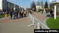 17:40 Пляцоўка месца збору агароджаная турнікетамі, стацыянарных рамак-мэталяшукальнікаў няма, міліцыянты правяраюць тых, хто ўваходзіць, ручнымі мэталяшукальнікамі. Усярэдзіну ўжо прайшло некалькі дзясяткаў чалавек. Бальшыня людзей, якія падыходзяць, стаяць абапал, за агароджу не праходзяць.