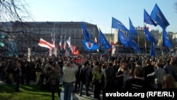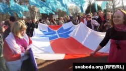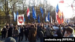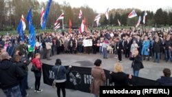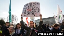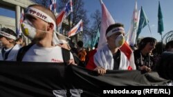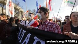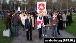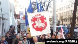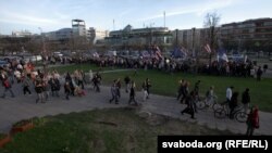18:35 Калёна скандуе «Свабоду Дашкевічу», «Свабоду Бяляцкаму», «Свабоду Аўтуховічу». Але ў транспарантах і лёзунгах пераважна чарнобыльская тэматыка. У калёне каля 3 тысяч чалавек.