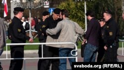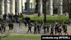 Падчас гэтага актывістаў затрымалі міліцыянты і павезьлі ў РАУС. Марат Несьцярэнка пасьпеў паведаміць, што на іх плянуюць складаць пратаколы за несанкцыянаваную акцыю. У заплечніку ў яго знайшлі некалькі ўлётак. Надалей ён слухаўку ня здымае.