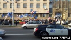 На вуліцы Акадэмічнай прыпаркавана пяць мікрааўтобусаў без нумароў, міліцэйская машына з гукаўзмацняльнай апаратурай, машыны хуткай дапамогі і ДАІ.
