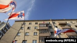 19:15 Дзяўчына на гаўбцы дому № 36 па вуліцы Сурганава вітае калёну бел-чырвона-белым сьцягам.