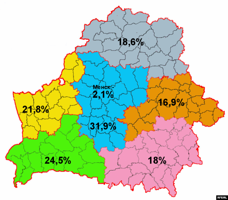 Мапа адказаў на пытаньне «Ці згодныя Вы з наданьнем расейскай мове аднолькавага статусу зь беларускай?» на рэфэрэндуме 1995-га.