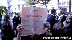 Людзі стаяць на ўваходах у Палац Фэстываляў у спадзяваньні знайсьці запрашальнік на прэм'еру "У тумане", альбо на "Касмаполіс" Дэвіда Кронэнбэрга.х