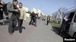 Затрыманьне журналістаў Сяргея Грыца (зьлева) і Аляксандра Баразенкі (справа каля аўто) падчас вулічнага пікета “Зьмены”