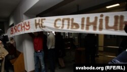 У фае судовага памяшканьня актывісты Праваабарончага цэнтру «Вясна» Зьміцер Салаўёў, Марына Статкевіч і Алена Лапцёнак разгарнулі транспарант з надпісам «Вясну не спыніць!»