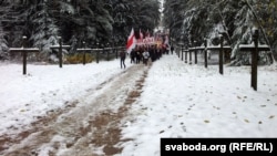11.33 Калёна пачала рухацца. Яе ачольвае былы палітвязень Сяргей Каваленка, які нясе вялікі бел-чырвона-белы сьцяг.