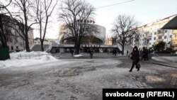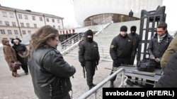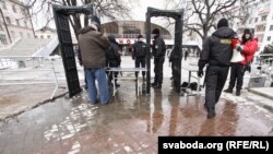 11.35 25 хвілінаў да пачатку акцыі. Людзей у цывільным заўважна паболела. Удзельнікаў як і раней няма. Пляцоўка перад кіратэатрам "Кастрычнік", агарожаная турнікетамі пустая.