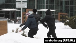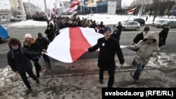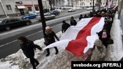 12.45 Дзяўчаты крычаць «Люблю Беларусь!» Ходнікі вельмі вузкія, не ачышчаныя ад сьнегу. Цяпер удзельнікі ідуць уздоўж друкарні — на іншы бок вуліцы калёну не пусьцілі міліцыяты.