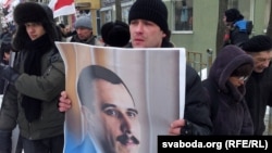 Актывісты «Маладога Фронту» прынесьлі вялікія партрэты палітвязьняў, а таксама плякат «Наступны Дзень Волі — на волі!». Партрэт Зьмітра Дашкевіча трымае ягоная жонка Наста Дашкевіч.