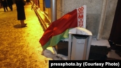 У камэнтарах да фатаграфіі (старонка 20) «Сарваны дзяржаўны сцяг ляжыць на вуліцы пасьля акцыі пратэсту» зьяўляецца ўласным вымыслам аўтара, які прымяншае гонар і годнасьць беларускага народа — Дзяржаўны сымбаль Рэспублікі Беларусь.