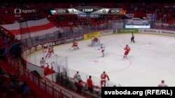 Падчас першага матчу чэмпіянату сьвету па хакеі ў Стакгольме паміж зборнымі Беларусі і Чэхіі беларускія заўзятары разгарнулі на трыбуне вялізны бел-чырвона-белы сьцяг.