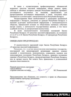 У папярэджаньні таксама адзначаецца, што «ў выпадку прадстаўленьня замежнай дзяржаве, замежнай ці міжнароднай арганізацыі заведама непраўдзівых зьвестак пра палітычнае, эканамічнае, сацыяльнае, вайсковае і міжнароднае становішча Рэспублікі Беларусь, прававое становішча грамадзян РБ, якія дыскрэдытуюць РБ і яе органы ўлады», журналіста могуць прыцягнуць да адказнасьці.