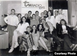 Радыё 101,2. Злева стаіць Юрась Бушлякоў. 1995 год.