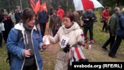 Удзельнікі шэсьця дабраліся да Курапатаў. Некаторыя падыходзяць да Крыжа Пакутаў, жагнаюцца і моляцца, ускладаюць кветкі.