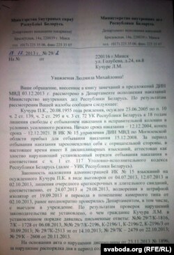 Напярэдадні Новага году Людміла Кучура атрымала ліст з МУС, у якім на ранейшую ейную просьбу даюцца дэталёвую справаздачу наконт спагнаньняў зь вязьняў за турэмныя камунальныя паслугі.