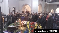 З кветкамі і вянкамі прыйшлі Ўладзімер Арлоў, Уладзімер Някляеў, Лявон Баршчэўскі і многія іншыя.У касьцёле грае арган. Людзі моляцца.