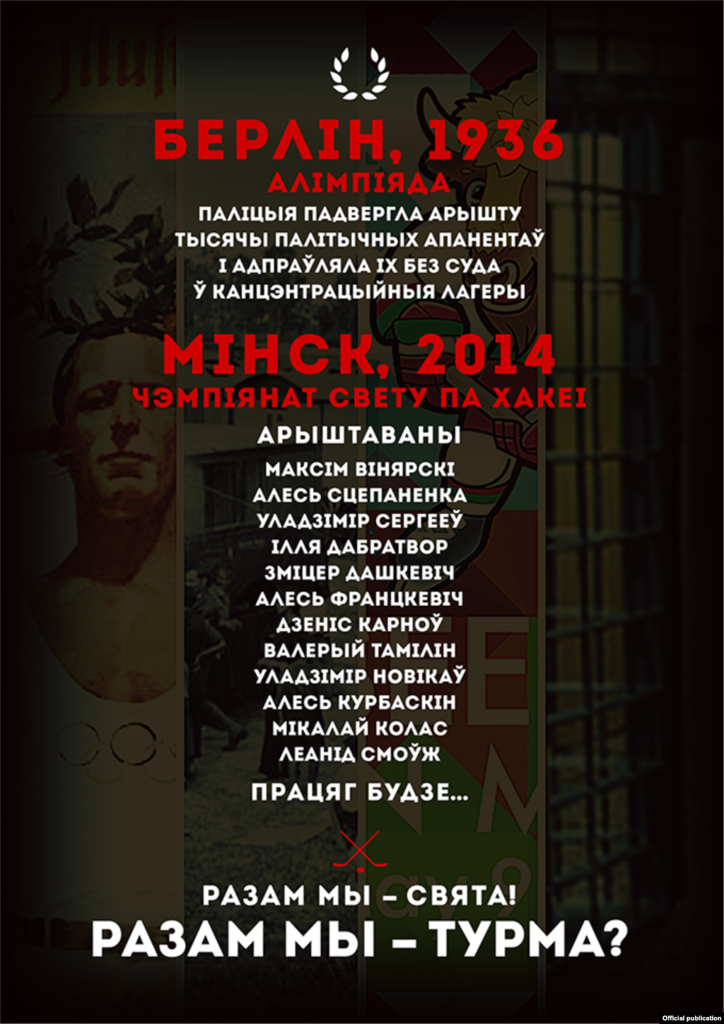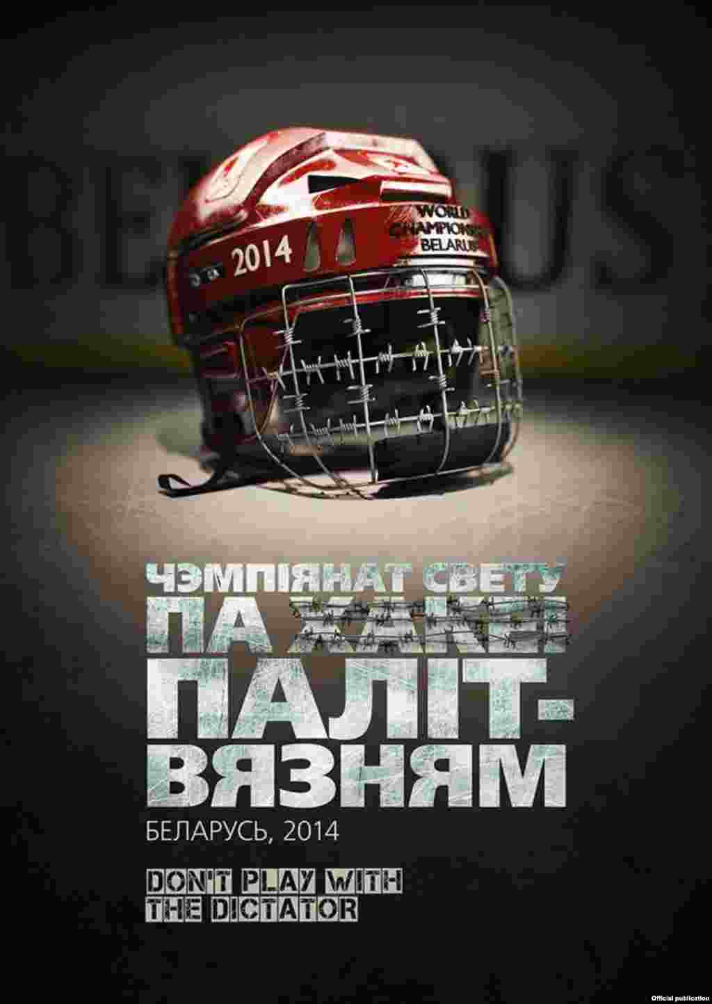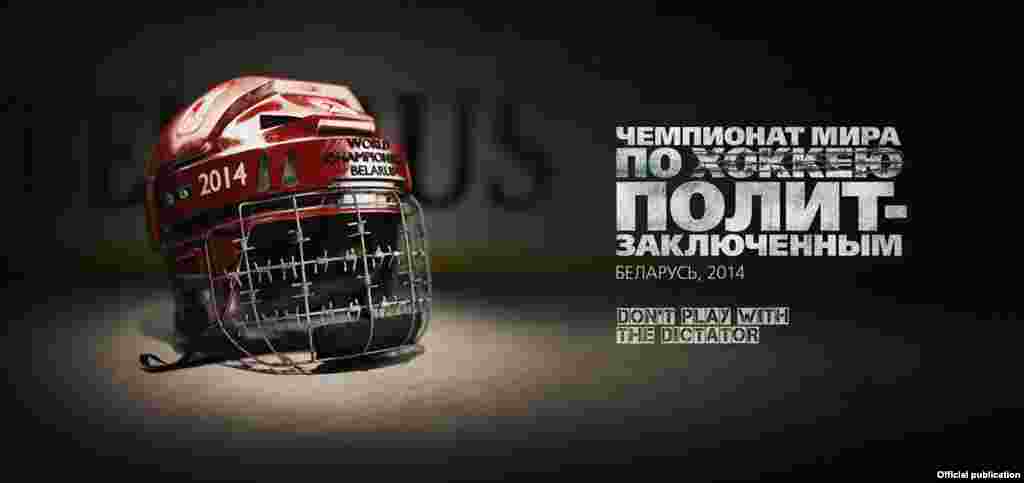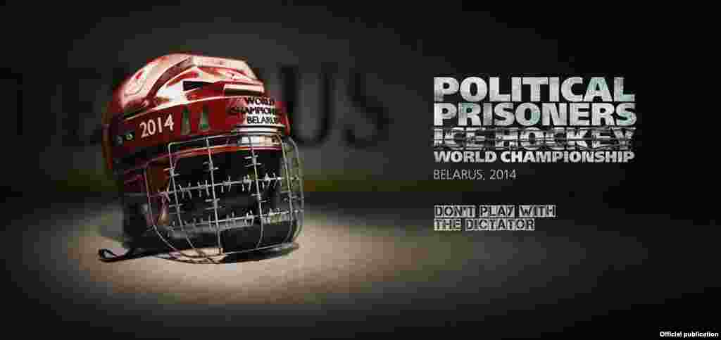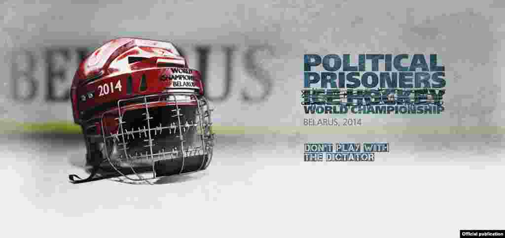 Таталітарны хакей. Плякаты пра палітвязьняў падчас чэмпіянату сьвету па хакеі ў Менску