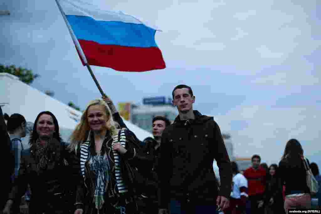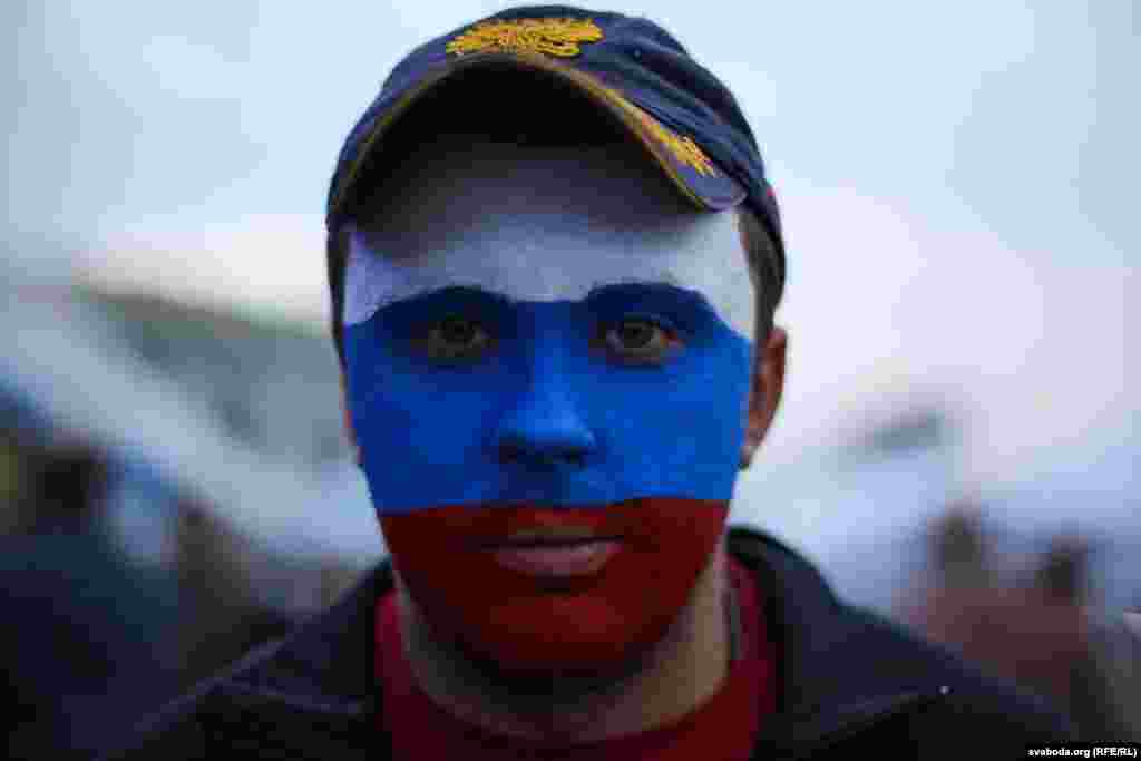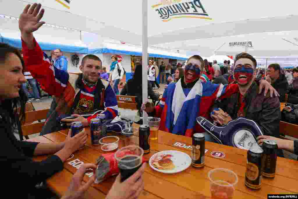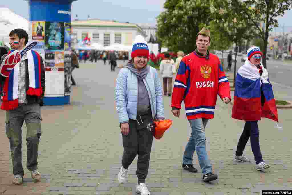 Па колькасьці заўзятараў, якія прыехалі ў Беларусь на Чэмпіянат сьвету па хакеі, расейцы займаюць першае месца. Менск прывыкае да вялікае колькасьці сьцягоў суседняй краіны. Але госьці не паводзяць агрэсіўна.