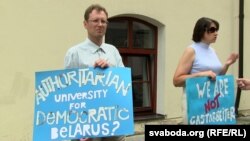 Як паведаміў Радыё Свабода адзін з удзельнікаў пікету Максім Жбанкоў, выкладчыкі, сярод якіх тры сэнатары, а таксама прадстаўнікі прафсаюзу, трымаюць плякаты, напісаныя па-ангельску і па-літоўску: «Аўтарытарны ўнівэрсытэт для дэмакратычнай Беларусі?», «Мы — не гастарбайтэры», «Падробны конкурс — падробныя выкладчыкі», «Дзе мае правы?», «Сустрэнемся ў судзе», «ЭГУ лічыць, што можа існаваць па-за літоўскім правам?».