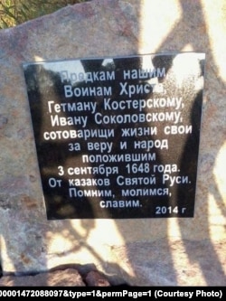 На дошцы ўзгадваюцца «Гетман Костерский, Иван Соколовский, сотоварищи жизни свои за веру и народ положившие 3 сентября 1648 года». І подпіс: «От казаков Святой Руси».