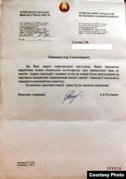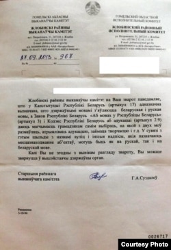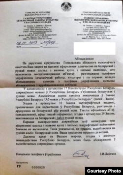 «Па даручэнні кіраўніцтва Гомельскага аблвыканкаму Ваш зварот разгледжаны галоўным упраўленнем ідэалагічнай работы, культуры і па справах моладзі аблвыканкама сумесна з галоўным упраўленнем юстыцыі аблвыканкама і гаррайвыканкамамі вобласці».