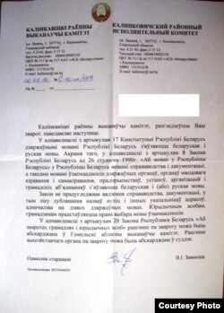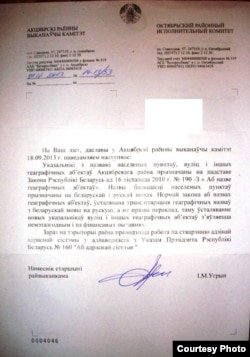 Намесьніца старшыні Кармянскага райвыканкаму Тацяна Шэхцер, здаецца, пра закон «Аб назвах геаграфічных аб’ектаў» ведае, хоць магчыма ня ведае пра закон «Аб зваротах грамадзян і юрыдычных асоб», паводле якога адказ на зварот павінен давацца на мове звароту. У маім выпадку зварот быў па-беларуску, але адказ быў падрыхтаваны на расейскай мове. Вось што паведамляецца ў адказе: