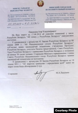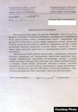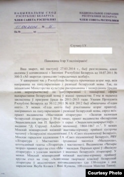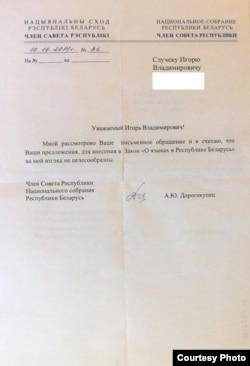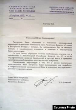 «Рассмотрев Ваше обращение в отношении законодательной инициативы по внесению изменений в Закон „О языках“ хотелось бы поблагодарить Вас за активную позицию и неравнодушное отношение к развитию и популяризации белорусского языка.