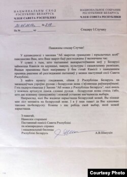 «У сувязі з тым, што пытаннямі выкарыстання моў у Беларусі займаецца Камісія па адукацыі, навуке, культуры і сацыяльнаму развіццю, Вашыя прапановы былі накіраваны ў бок гэтай Камісіі з пажаданнем прыняць рашэнне аб разгледжванні пытанняў у межах наступнай сесіі Савета Рэспублікі».