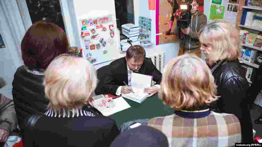 На прэзэнтацыю новай кнігі сабралася поўная заля кнігарні «Логвінаў». У вечарыне ўзялі ўдзел літаратары Уладзімер Арлоў і Анатоль Вярцінскі, мастак Генадзь Мацур, паэт Андрэй Хадановіч ды іншыя.