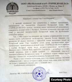 «ФК „Тарпэда-БелАЗ“ цалкам падзяляе вашы хваляваньні аб належным становішчы роднай мовы ў Беларусі. Хочацца адзначыць, што наш клюб стаяў ля вытокаў выкарыстаньня роднай мовы на футбольных пляцоўках краіны. Так, з 1993 года і па сёньняшні дзень гукавое суправаджэньне гульняў нашага клюбу адбываецца па-беларуску, таксма больш за 20 год артыкулы аб жыцьці каманды ў гарадзкой газэце выходзяць толькі на беларускай мове. Ужо 4-ты сэзон запар пасьляматчавыя прэс-канфэрэнцыі праводзяцца на роднай мове. „Тарпеда-БелАЗ“ першым з клюбаў Беларусі пачаў весьці інтэрнэт-трансьляцыі па-беларуску. У далейшых плянах нашага клюбу існуюць і іншыя ідэі па распаўсюджваньні беларускай мовы».