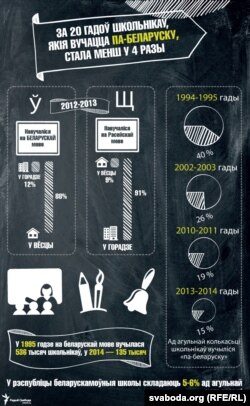 У 1994-1995 гг, калі Лукашэнка толькі прыйшоў да ўлады, амаль 40% школьнікаў навучаліся па-беларуску. У 2014 г. гэтая лічба складала ня больш за 15%.