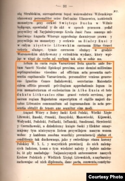 Вось фрагмэнт прывілею Аўгуста ІІ Моцнага праваслаўным жыхарам і сьвятарству «Беларусі і ўсяго Княства Літоўскага». Чырвоным тут пазначаныя жыўцом устаўленыя лацінскія выразы й сказы.