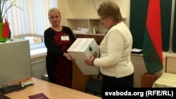 Старшыня камісіі спадарыня Філімонава ня стала забараняць карэспандэнту Свабоды рабіць фота ў пакоі для галасаваньня, у тым ліку тое, як выбарчую скрыню яна хавала ў сэйф на час абеду.