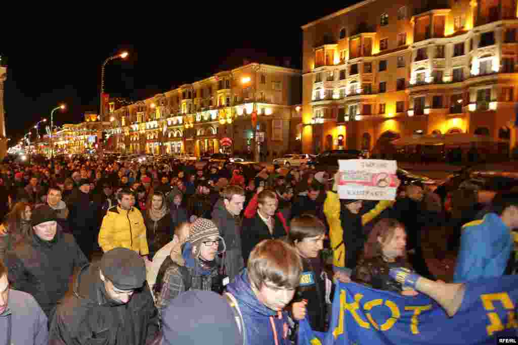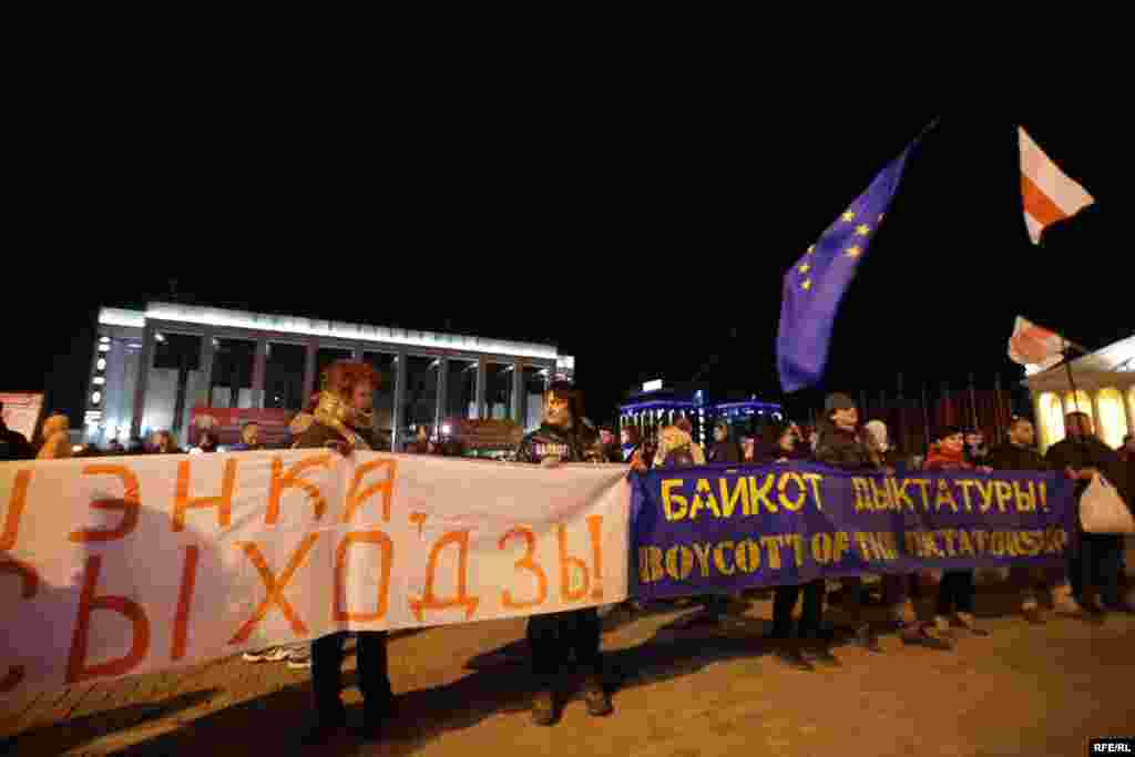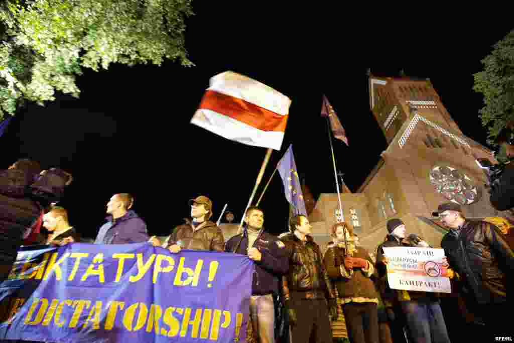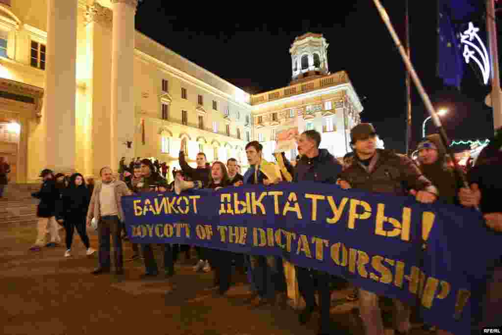 Некалькі соцень чалавек сабраліся на Кастрычніцкай плошчы пратэставаць супраць фальсыфікацыяў выбараў. Актывісты разгарнулі бел-чырвона-белыя сьцягі і расьцяжкі супраць дыктатуры. Яны прайшлі шэсьцем да плошчы Незалежнасьці, дзе акцыя скончылася супольнай малітвай