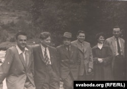 7. З калегамі пісьменьнікамі. Зьлева направа: Янка Брыль, Максім Танк, Усевалад Краўчанка, Пімен Панчанка.