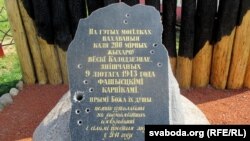 «Тут пахаваныя мірныя жыхары вёскі Калодзезнае, зьнішчаныя 9 лютага 1943 году фашысцкімі карнікамі. Прымі, Божа, іх душы. Помнік усталяваны на дабрачынныя ахвяраваньні», — напісана на пліце. Сярод тых, хто пералічваў грошы на дабрачынны рахунак, які адкрыў Віктар Дашкевіч, быў і амбасадар Нямеччыны ў Беларусі, якога актывіст зьбіраўся запрасіць на асьвячэньне помніка.