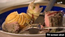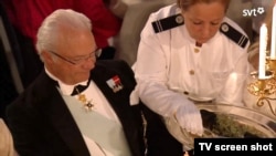 Месца першага беларускага нобэлеўскага ляўрэата — за чатыры крэслы ад прынцэсы Сафіі і за сем крэслаў ад караля Швэцыі Карла XVI Густава (ён сядзіць па іншы бок стала). А насупраць Сьвятланы Алексіевіч — міністар ў справах навукі Канады Крысьцін Дункан, прэм’ер-міністар Швэцыі Стэфан Лёвэн і сьпікер швэдскага парлямэнту Урбан Алін.