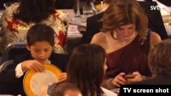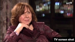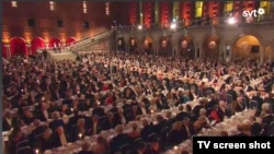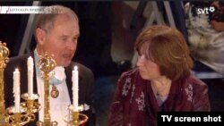 Зьлева ад Алексіевіч — Свантэ Лінквіст, рыксмаршал (кіраўнік прыдворнага ведамства) Швэцыі, а па правую руку ад пісьменьніцы — Міхаэль Сольман, былы выканаўчы дырэктар Нобэлеўскага фонду.