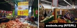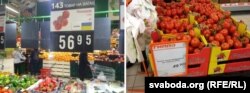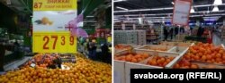 За кіло мандарынаў трэба аддаць 21 100 у Кіеве і 23 900 у Менску. Памідоры на галінцы каштуюць 43 900 у Кіеве і 49 900 у Менску. Агуркі зімой дарагія паўсюль, але кошты адрозьніваюцца ў два разы: 27 700 у Кіеве і 55 000 — у Менску. Капуста каштуе 8 100 у Кіеве і 5 200 у менскай краме. Цыбуля: 6 500 і 7 900 адпаведна. Бульба: 4 400 у суседзяў і 7 000 у нас.