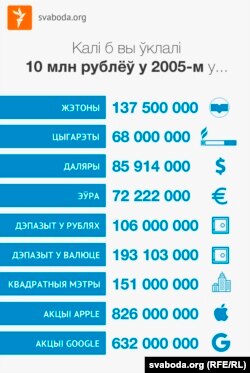 Калі ж вы пакінулі ў 2005 годзе 10 мільёнаў беларускіх рублёў «пад падушкай», то да 2015 году вы б страцілі большую частку гэтай сумы — каля 4000 даляраў у пераводзе на амэрыканскую валюту.