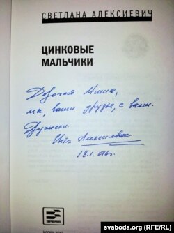 Сярод кніг, якія апошнім часам падпісала сваім чытачам ляўрэатка Нобэлеўскай прэміі Сьвятлана Алексіевіч, дзьве — палітвязьню Міхаілу Жамчужнаму. Бліжэйшым часам яны будуць перададзеныя ў папраўчую установу ў Навасадах, дзе той адбывае пакараньне. Так здаралася, што Сьвятлана Алексіевіч сачыць за яго лёсам. Адну з кніг — «Цынкавыя хлопчыкі» пісьменьніца падпісала так: