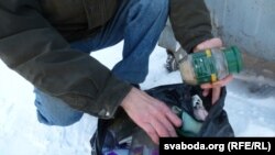 Суразмоўца дастаў з кантэйнэру прыхаваную ад журналіста торбу, наладаваную выбранай са сьмецьця спажываю. Пагадзіўся паказаць, што ў ёй.