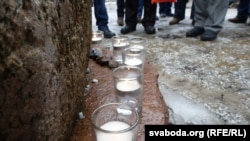 На вуліцу Лазарэнкі да каменя з высечанымі далонямі прыйшлі больш за трыццаць чалавек. Яны, паводле габрэйскай традыцыі, паклалі каменьчыкі да памятнага знаку ды запалілі шэсьць сьвечак, у памяць пра шэсьць мільёнаў ахвяраў Галакосту.