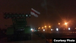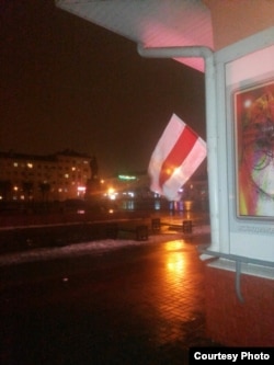 Па словах хлопца, сьцягі ніхто не сымаў. Мажліва, гэта з-за таго, што іх вывесілі, як толькі на вуліцах запалілі сьвятло.