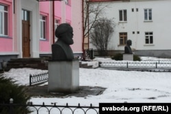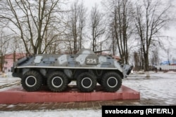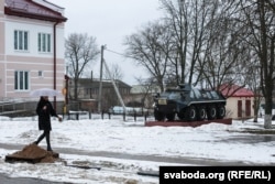 Праз бэтонную арку зь пяцікутнай зоркай відаць хрэстаматыйны помнік савецкім воінам. На фоне ружовага будынку — бюсты Карла Маркса і Ўладзімера Леніна. За Марксам — новазбудаваная зь белай «дачнай» цэглы царква з бліскучымі купаламі. Насупраць гэтай ідэалягічна падгулялай кампазыцыі — БТР у гонар воінаў-афганцаў.