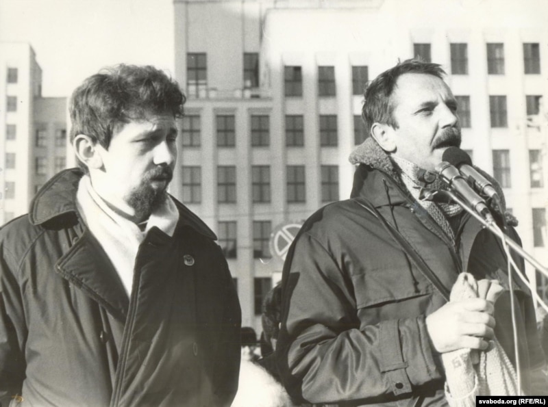 Валер Сядоў выступае на мітынгу на плошчы Леніна. Зьлева — Сяргей Навумчык. 1992 г.