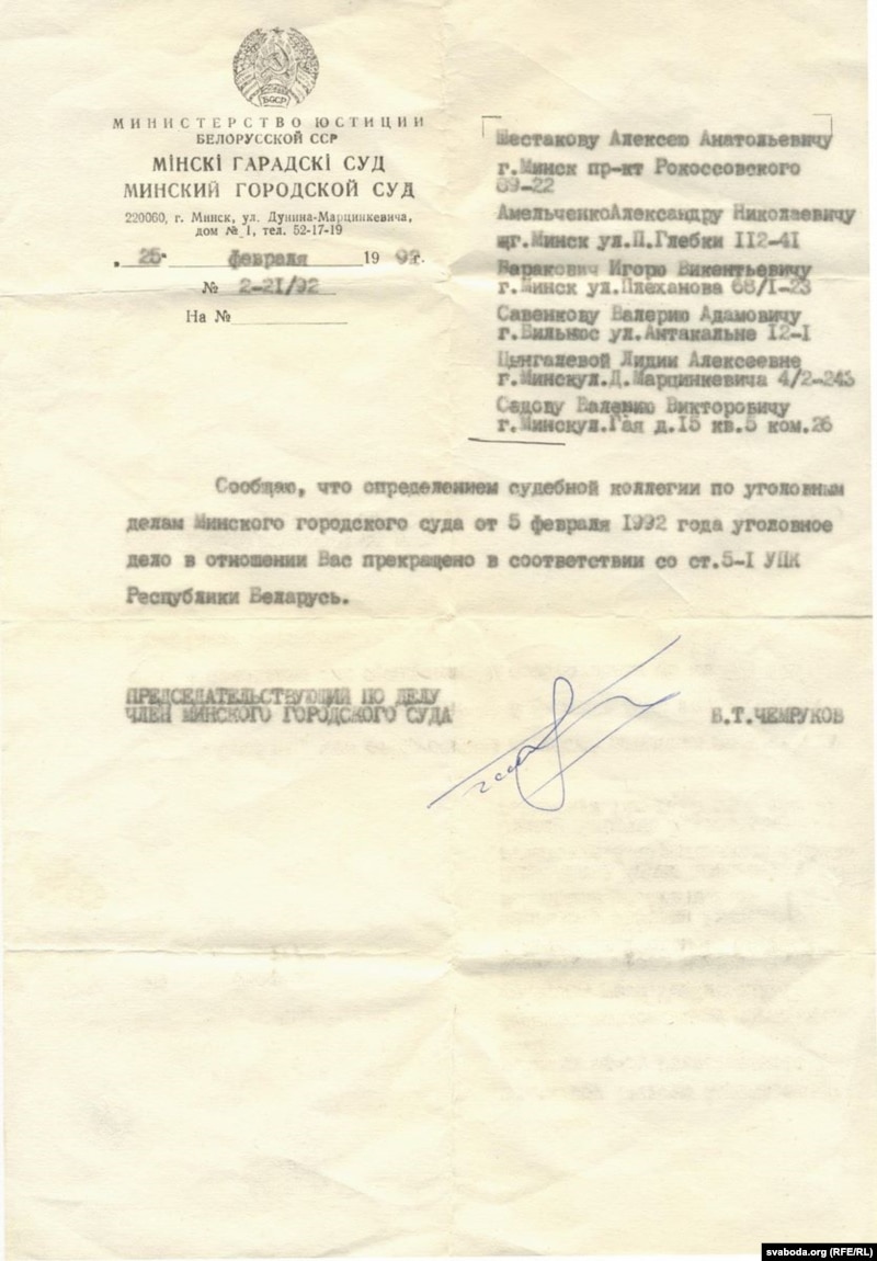 Крымінальная справа супраць Валера Сядова была спыненая толькі ў 1992 годзе.