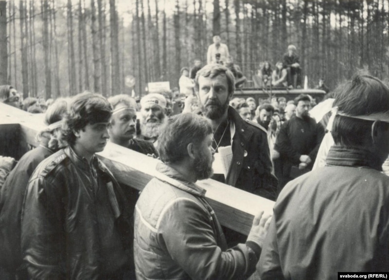 Усталяваньне першага крыжа ў Курапатах. 1989 г. Валер Сядоў — у цэнтры.
