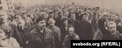 З розных канцоў Менску да Дому ўраду рушылі калёны рабочых МАЗу, трактарнага, маторнага заводаў ды іншых прадпрыемстваў.